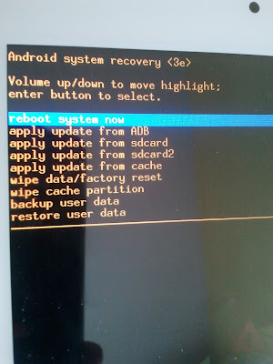 - gdy na ekranie pojawi się leżący robot, naciśnij przycisk "Power", wyświetli się "recovery menu" i tutaj UWAGA! Nawigowanie po tym menu odbywa się odwrotnie niż w poprzednim tzn. przycisk "Volume+" służy do zatwierdzania wyboru, a "Volume-" do przełączania między opcjami